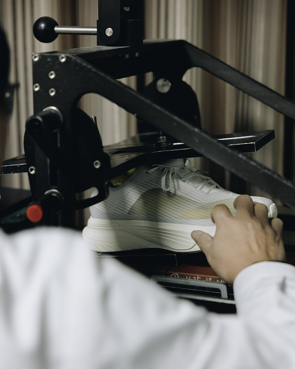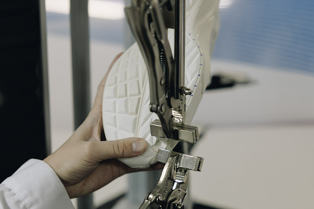 비로소 모든 공정이 끝났다. 하지만, 신발은 곧바로 출고되지 않는다. 완성된 신발은 공장을 떠나기 전 연구실로 옮겨진다. 이곳에서는 사람이 아니라 기계가 먼저 신발을 신는다. 기계는 같은 동작을 수천수만 번 반복한다. 바닥에 닿는 충격을 재현하고, 뒤틀림을 만들고, 특정 각도로 신발을 접는다. 신발이 얼마나 버티는지, 어느 지점에서 형태가 무너지는지를 확인하기 위해서다. 사람이 신었을 때는 느끼기 어려운 변화들이, 숫자와 그래프로 기록된다.