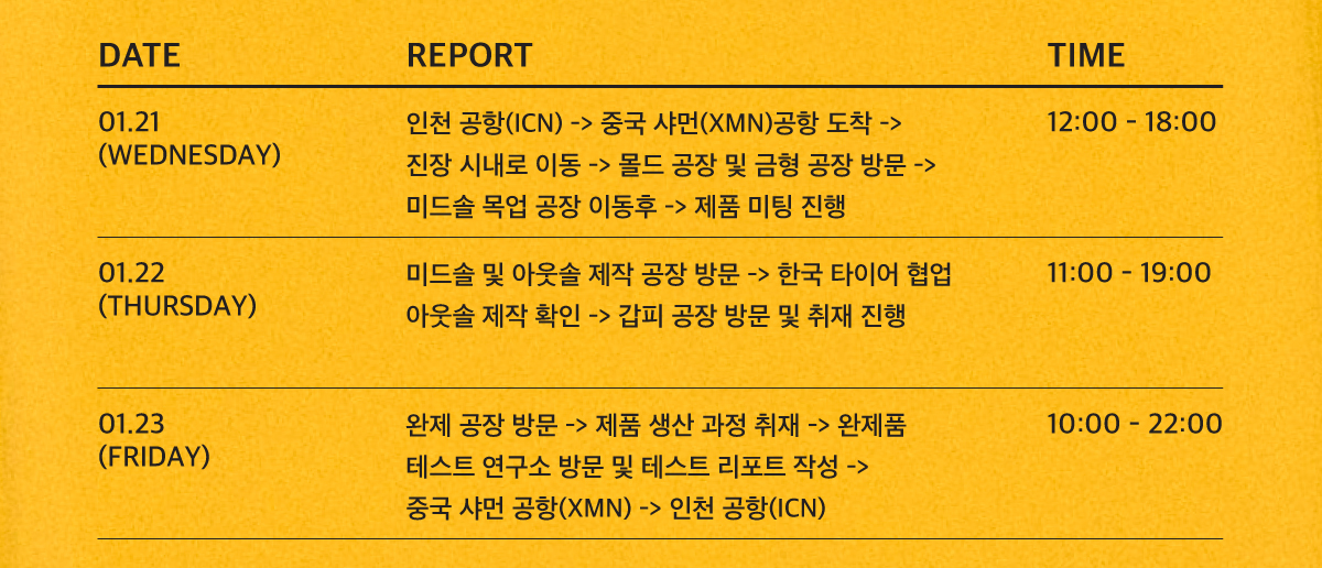 ✔️ 신발은 어디서부터 만들어지기 시작할까 ✔️ 몰딩과 금형은 왜 다른 단계로 존재할까 ✔️ EVA 성형은 어떤 방식으로 형태를 얻을까 ✔️ 미드솔과 아웃솔은 왜 따로 만들어질까 ✔️ 완성된 신발은 왜 다시 테스트를 거칠까 ✔️ 공장을 보고 나면, 신발은 어떻게 달라 보일까 |
